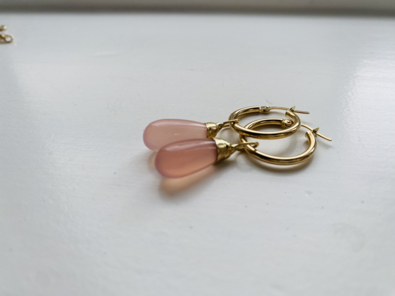 Overzicht14krt gouden Creolen (19mm) met een roze Chalcedone. De totale lengte van de oorbellen is ongeveer 4cm.