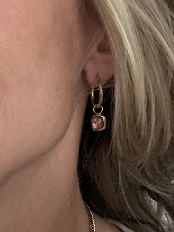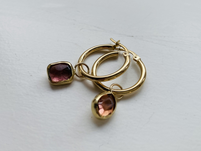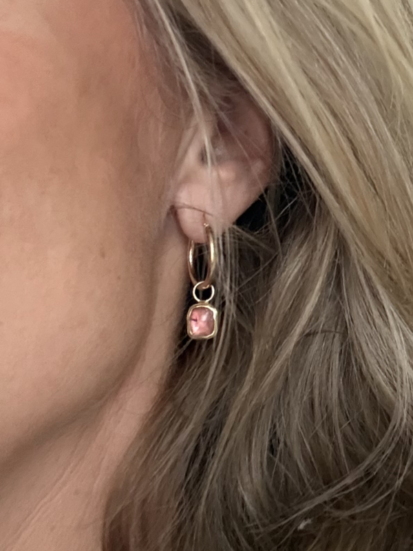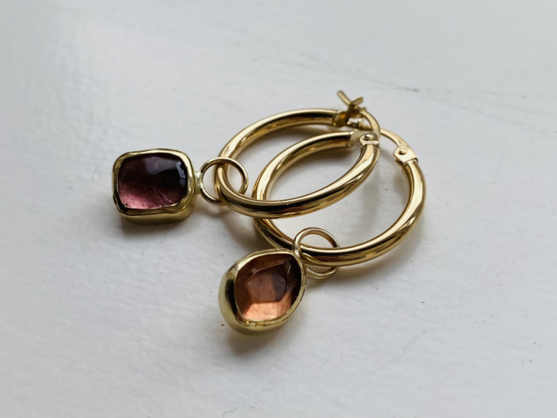 Overzicht14krt gouden Creolen (19mm) met Toermalijnen. De Toermalijnen zijn grillig van vorm en zijn in een warme kleur van roze/rood. De oorbellen zijn ca. 3cm lang.