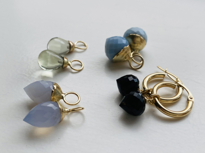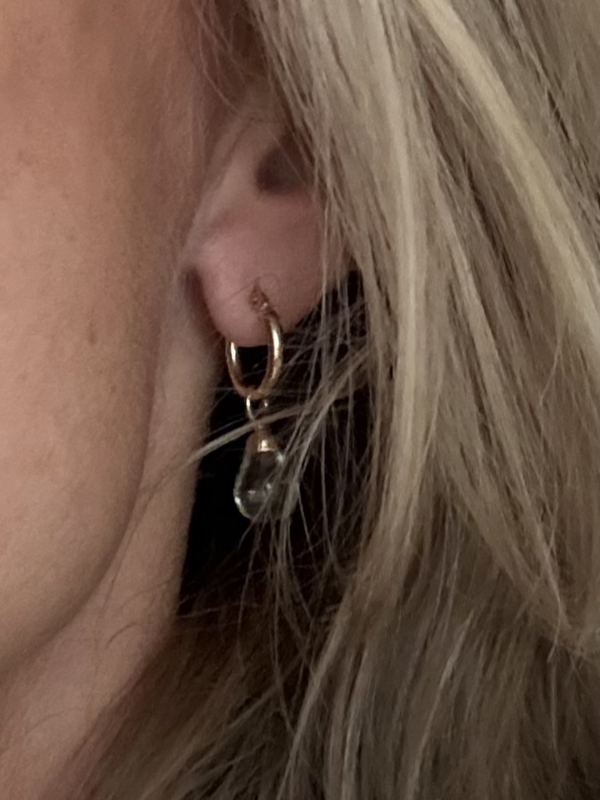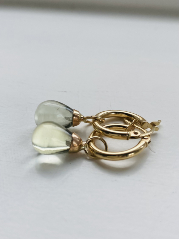 Overzicht14krt gouden Creolen (14mm) met een hangertje met Prasioliet (groene Amethist). De lengte van de oorbellen is ca. 2.8cm.