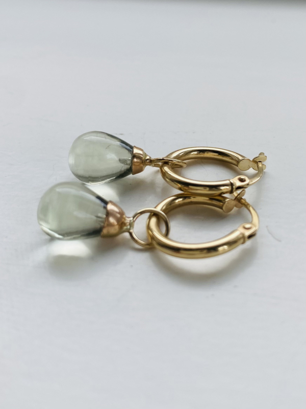 Gouden Creolen met Prasioliet 14krt14krt gouden Creolen (14mm) met een hangertje met Prasioliet (groene Amethist). De lengte van de oorbellen is ca. 2.8cm.