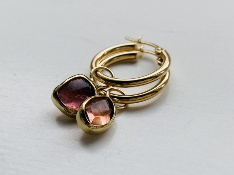 Gouden creolen met Toermalijn (14krt)14krt gouden Creolen (19mm) met Toermalijnen. De Toermalijnen zijn grillig van vorm en zijn in een warme kleur van roze/rood. De oorbellen zijn ca. 3cm lang.